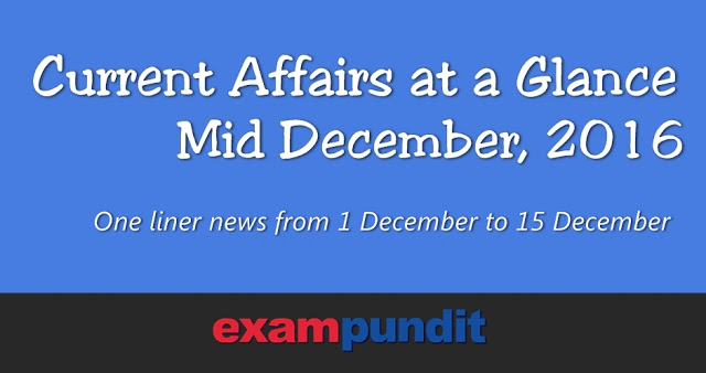 Hello and welcome to exampundit . So here is the Current Affairs at a Glance PDF of Mid-December, 2016. The PDF contains one liner news from December 1 to December 15.