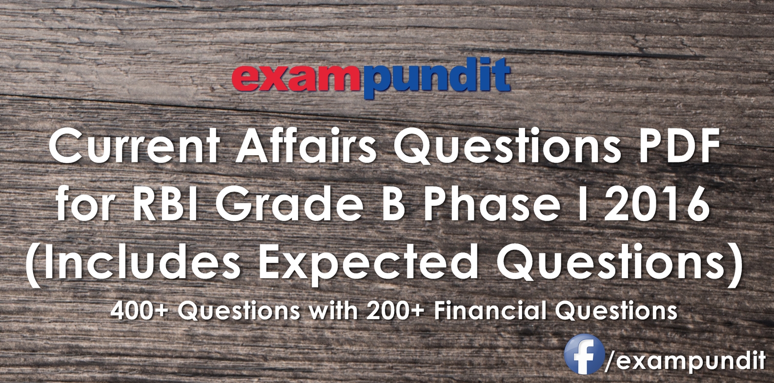 Hello and welcome to exampundit . Here is the much awaited Current Affairs Questions PDF for the upcoming RBI Grade B Phase I 2016. This PDF has over 400 questions total from June, July & August(till 24th), 2016.