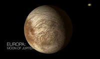 - Europa is covered by an ice shell perhaps 80 kilometres thick, but underneath this crust is thought to lie a huge ocean of liquid water about 20 kilometres deep.