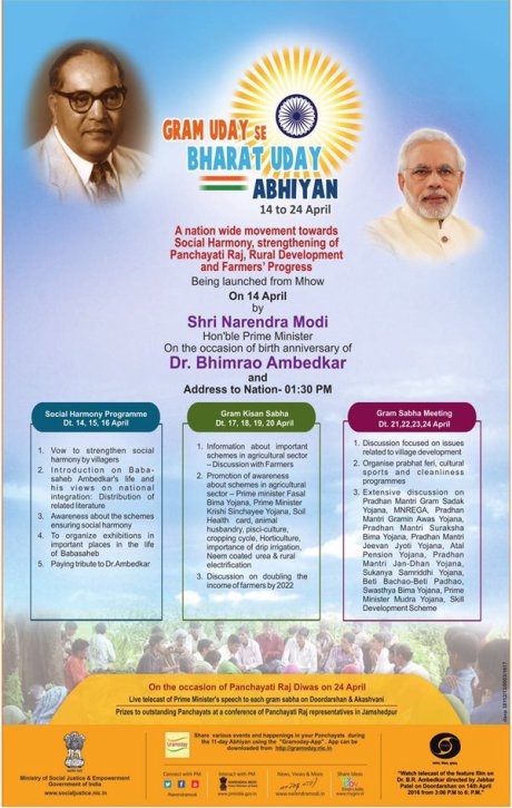 - PM Narendra Modi on 14 April 2016 launched 'Gram Uday Se Bharat Uday Abhiyan' at Mhow, Madhya Pradesh. The Abhiyan (campaign) was launched on the 125th birth anniversary of Babasaheb Ambedkar at his birthplace to strengthen Panchayati Raj in villages and ensure social harmony in villages.