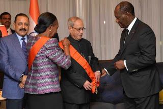 - President Pranab Mukherjee has been accorded the highest honour “Grand Cross National Order of the Republic of Cote D’Ivoirie” of Cote D’Ivoirie by its President Alassane Ouattara on his maiden visit.