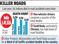 - Over 1.4 lakh people died in road accidents in 2014, a slight increase over the previous year. Uttar Pradesh, Maharashtra and Tamil Nadu account for a third of all traffic accident deaths. Two-wheelers account for over a quarter of all fatal road accidents, the largest number of them in Tamil Nadu and Maharashtra.