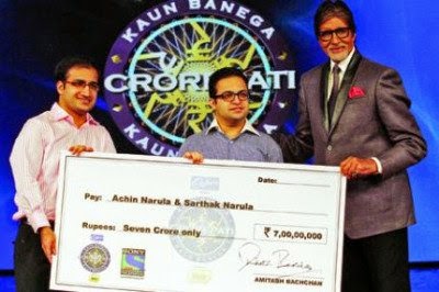 - · The Narula brothers of Delhi on 20 September 2014 became the first ever contestants to win 7 crore rupees in the television show, Kaun Banega Crorepati, hosted by Amitabh Bachchan. The two brothers, Achin and Sarthak Narula emerged victorious in Season 8 of the show after answering 14 questions correctly, with help of four lifelines.