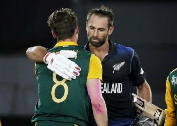 - Chasing a stiff target of 298 runs in 43 overs under the Duckworth/Lewis rule in the rain—curtailed game, New Zealand crossed the line when Grant Elliot (84) smashed Dale Steyn over long-on for a six with just one ball to spare in a thrilling showdown.