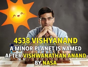 - Michael Rudenko, a committee member of the Minor Planet Center on 1 April 2015 officially named a minor planet as 4538 Vishyanand, to honour India’s first chess grandmaster, Vishwanathan Anand.