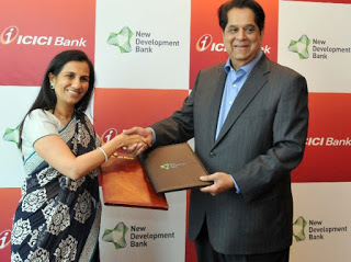 - New Development Bank (NDB), headed by K V Kamath, has chosen ICICI Bank, which he used to head, for its first tie-up with any bank in India to explore opportunities around bond issuances, co-financing, treasury management and human resources.