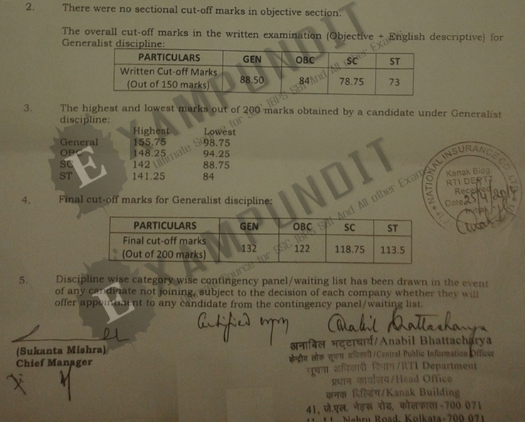 Hello and welcome to ExamPundit. So, thanks to Pruthvi for mailing us the Cut-off marks for the generalist administrative officers in New India Assurance, National Insurance and United India Insurance and Oriental Insurance Co. Ltd.