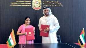 - India and the UAE on Tuesday signed two agreements, including one on currency swap, as external affairs minister Sushma Swaraj held exhaustive discussions with her counterpart Abdullah bin Zayed Al Nahyan to step up cooperation in areas such as trade, security and defence.