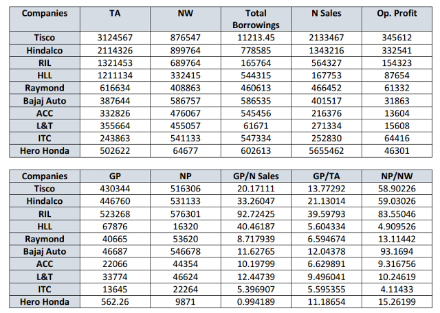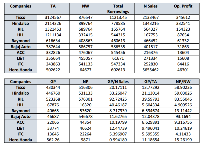 2. From the column of net profits of the companies, we can easily conclude that RIL has the highest profit