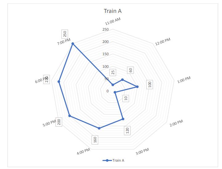 Two Trains A and B are travelling in opposite directions from station X to station Y and from station Y to station X, respectively. The following graphs give the cumulative distance covered by the trains at hourly intervals, beginning with the first hour. Refer to the data and answer the questions that follow.