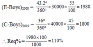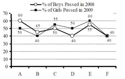 In the given pie -charts the distribution of passed students from six different colleges (A, B, C, D, E and F) of a city during the year 2008 and 2009 is given. In the line graph the percentage of boys passed in year 2008 and the percentage of girls passed in 2009 is shown. Answer the following questions based on these graphs.