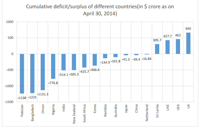 Average of middle five deficit countries = 2588.5/5 = 517.7 (near to deficit of India)