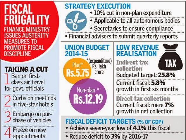 A Finance Minstry release on Thursday's cuts said the objective of the fiscal prudence and economy measures is the need to rationalise expenditure and optimize available resources. It also said that the Ministry had been issuing the austerity instructions from time to time with a view to containing non-developmental expenditure and releasing of additional resources for priority schemes. The last set of instructions was issued on September 18, 2013 after the Union Budget, it said.