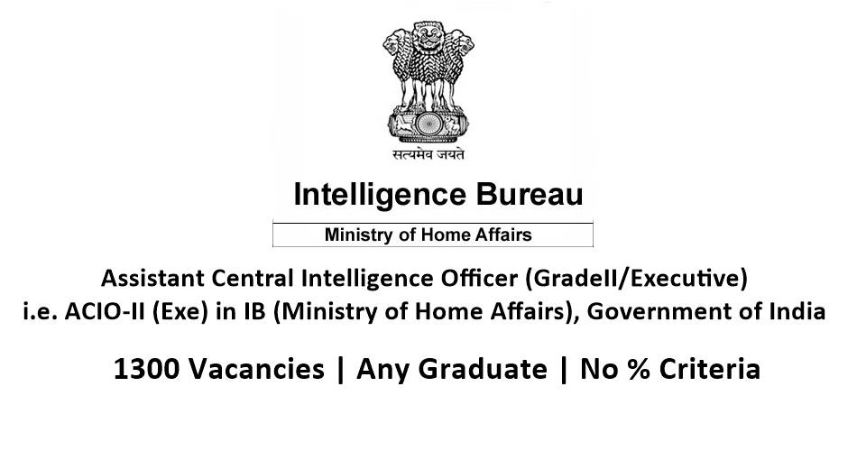 Hello and welcome to exampundit. Online applications are invited from Indian Nationals for direct recruitment to the post of Assistant Central Intelligence Officer (GradeII/Executive) i.e. ACIO-II (Exe) in IB (Ministry of Home Affairs), Government of India.