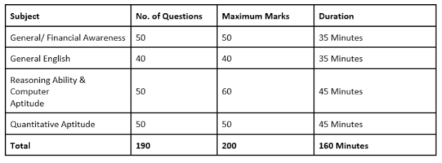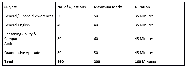 - Exam consists of 190 questions. Out of which 40 questions are from English Language, 50 questions from Reasoning & Computer Aptitude, 50 questions from General/Finance Awareness, 50 questions from Quantitative Aptitude and 40 questions from Computer Knowledge.