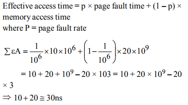- Let the page fault service time be 10 Ms in a computer with average memory access time being 20 ns. If one page fault is generated for every 106 memory accesses, what is the effective access time for the memory?