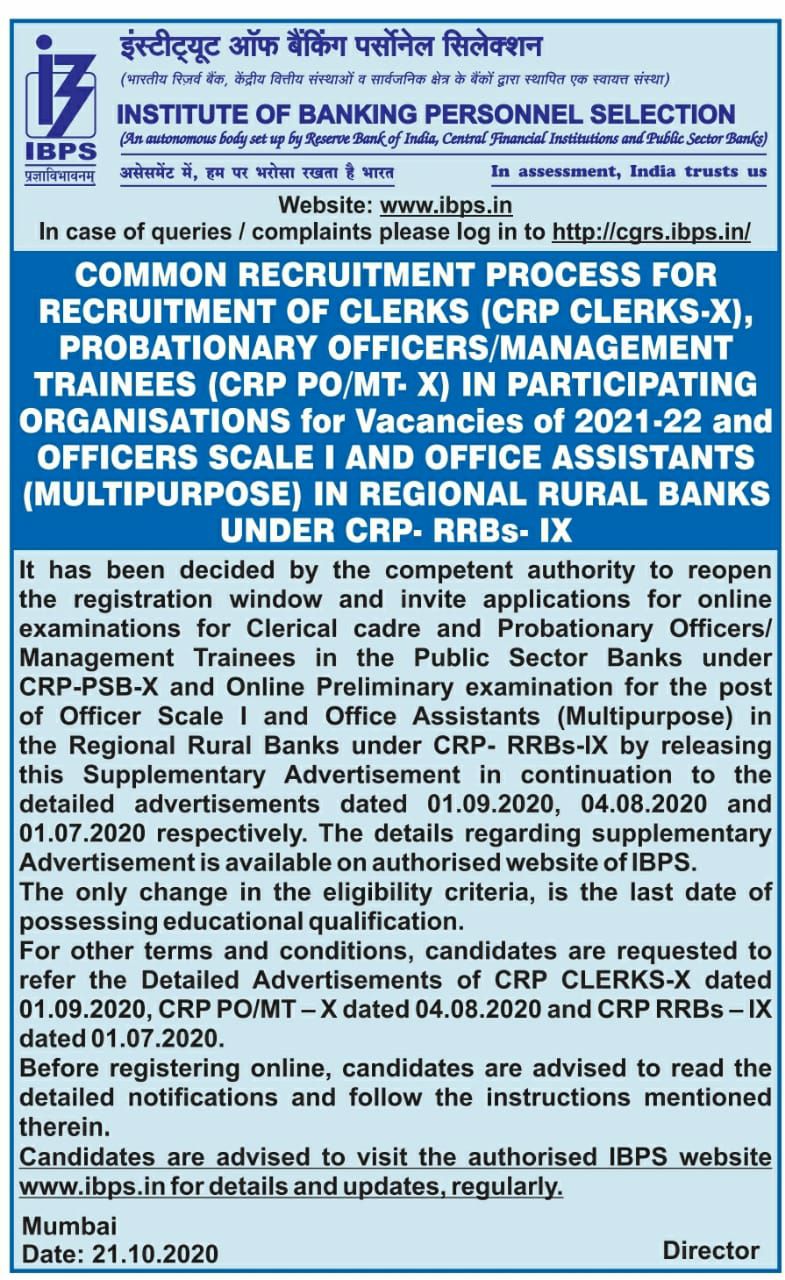 Dear Aspirants, IBPS has released Supplementary Advertisement for Recruitment of Officers (Scale-I) and Office Assistant (Multipurpose) in Regional Rural Banks (RRBs) - CRP RRBs IX. Candidates can those who attained the eligibility in terms of educational qualifications by 09.11.2020 and Who could not register successfully from 01.07.2020 to 21.07.2020.