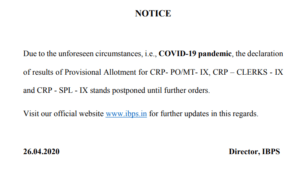 Dear Followers, IBPS has released notice regarding postponement of results of Provisional Allotment for IBPS CRP-IX PO, Clerk and SO. Due to unusual situation many of you get confused about the IBPS PO, Clerk SO provisional allotment 2019. From the official notice regarding IBPS PO, Clerk SO provisional allotment results, the final provisional allotment will be released after the unforeseen circumstances has been ended. Herewith we have provided official notice about IBPS PO, Clerk SO provisional allotment 2020.