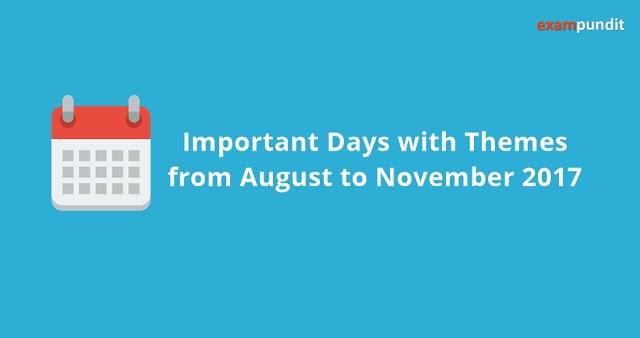Hello and welcome to exampundit. As requested by many, here is a PDF on Important Days with Themes from August to November 2017. This is extremely important for the upcoming IBPS RRB, PO, Clerk Mains exams in 2017 as well as OICL AO and RBI Assistant Mains 2017.