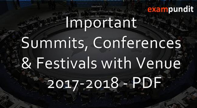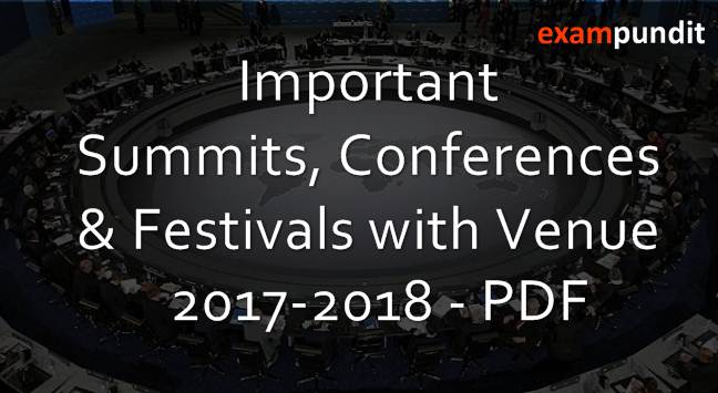 Hello and welcome to exampundit. Here is a PDF with list of Important Summits,Conferences & festivals with Venue between 2017 and 2018. The pdf is created by our mentor, Ruchi.