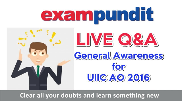 Hello and welcome to exampundit . In today's Live Q&A, we will learn all the important questions and doubts regarding UIIC AO General Awareness. Stick to the topic, else your comments, will be DELETED.