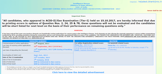 "All candidates, who appeared in ACIO-II/Exe Examination (Tier-I) held on 15.10.2017, are hereby informed that due to printing errors in options of Question Nos. 2, 24, 25 & 78, these questions will not be evaluated and the candidates will be short listed for next level on the basis of their performance on remaining questions only."