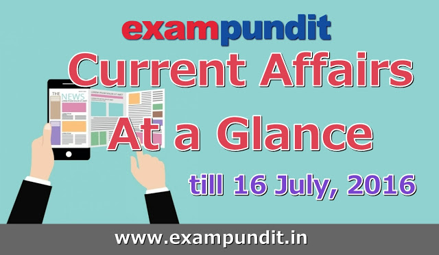 Hello and welcome to exampundit . Here is the Mid-Monthly e-Magazine of Current Affairs at a Glance from July 1 to July 16, 2016. This contains every current affairs at a glance in one or two lines.