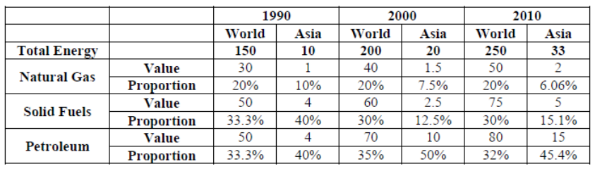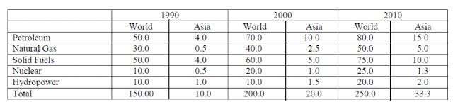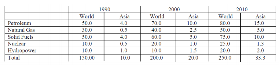 Given below are the forecasts of the World and Asian energy demand for the years 1990, 2000 and 2010 AD. The demand is given in million barrels per day, crude oil equivalent.