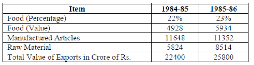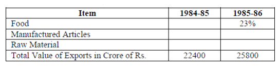 In 1984 – 85 value of exports of manufactured articles exceeds over the value exports of raw materials by 100%. In 1985– 86 the ratio of % of exports of raw materials to that of exports of manufactured articles is 3 : 4. Exports of food in 1985– 86 exceeds the 1984 – 85 figures by Rs. 1006 crore.