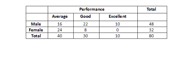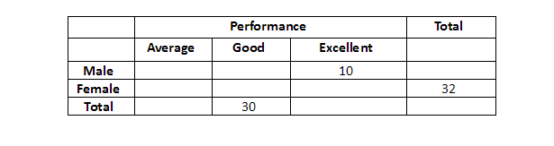 A professor keeps data on students tabulated by performance and sex of the student. The data is kept on a computer disk, but unfortunately some of it is lost because of a virus. Only the following could be recovered:
