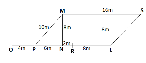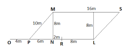 is 10m to the west of L and 8m to the south of M. O is 20m to the west of L. P