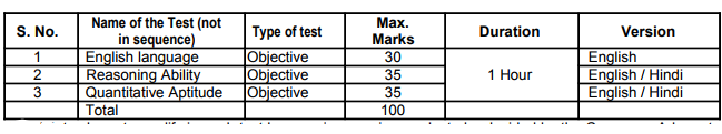 Phase-I: Preliminary Examination Preliminary Examination consisting of Objective Tests for 100 marks will be conducted online. This test would be of 1 hour duration consisting of 3 sections as follows: