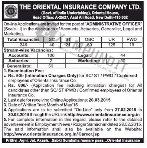 Hello and welcome to ExamPundit. Oriental Insurance Company has issued notification in various newspapers today about recruitment of 246 AO in 2015.