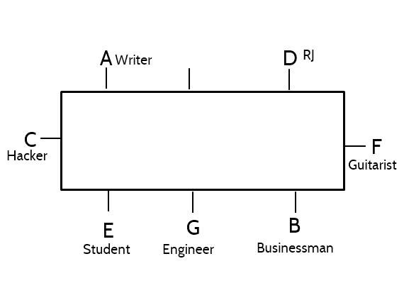 Seven people A,B,C,D,E,F,G are sitting around a rectangular table. There are three seats horizontally and one seat vertically on the table. There is one vacant seat. They are of different professions: RJ, Guitarist, Hacker, Businessman, Writer, Student, Engineer. Neither A or D is neighbour of the Engineer. C is on the third left of B. The Hacker is facing neither the Engineer nor the writer. The business man is seated with the Student. B is neither facing A nor F. D & F are neighbours, but on different sides. There are two seats between A & F. The Writer is not facing the Guitarist’s neighbour. Dis facing the business man. A & D are on the same side. E is not facing the vacant seat. A is on the second left of the Student. The Hacker is on the second left of the Engineer.