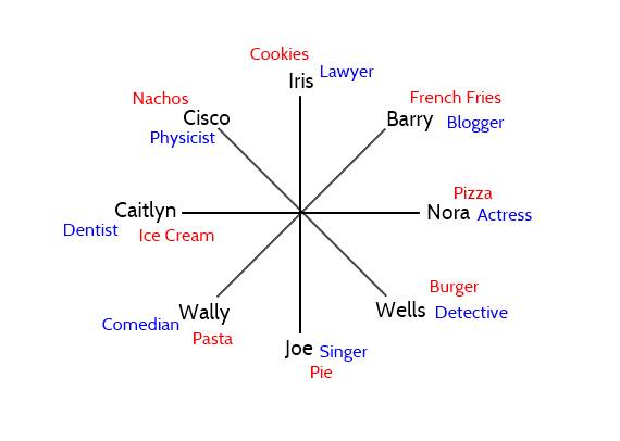 Eight friends Nora, Harrison, Wally, Caitlyn, Cisco, Barry, Iris, Joe are sitting around a circular table. They are of different professions: Actor, Detective, Blogger, Physicist, Comedian, Singer, Dentist, Lawyer. They order different food @Jitters : Pie, Pizza, Cookies, Nachos, Ice Cream, Burger, Pasta, French Fries ; but definitely not in the same order. Nora is on the third left of the person who orders Nachos & doesn’t like ice cream. Neither Iris nor Barry is a Comedian. The actor is sitting on the second left of the person who loves Cookies. Wally and Joe are next to each other. Barry is one of the neighbours of Iris. The one who loves Cookies is facing the Pie lover and none of them is neighbour with the Dentist. The Actor and the Lawyer are not neighbours of the Comedian. Barry likes French Fries. Iris is facing the Singer. The Blogger is not a neighbour of the Pie lover, but Iris's. The Detective eats Burger. Cisco is the Physicist and sitting on the second left of Wally. Harrison is on the third right of the Dentist. The Blogger is a neighbour of the Actor facing the Pasta lover. Joe is neither Comedian nor Dentist.