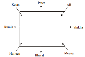 sit at any of the corners. Meenal sits third to the right of Peter.