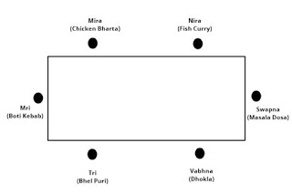 6 people: Vabhna, Tri, Nira, Mri, Swapna, Mira went to a restaurant and seated on a rectangular table and ordered for six different dishes:Bhel puri,Fish Curry,Boti Kabab, Dhokla, Chicken Bharta, Masala Dosa,but not necessarily in the same order. Maximum of them are facing the table. Two people are seating on each side of the table and one on each end.