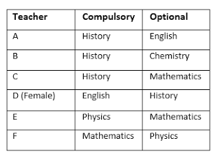 There are six teachers A, B, C, D, E and F in a school. Each of the teachers teaches two subjects, one compulsory subject and the other optional subject. D’s optional subject is History while three others have it as compulsory subject. E and F have Physics as one of their subjects. F’s compulsory subject is Mathematics which is an optional subject of both C and E. History and English are A’s subjects but in terms of compulsory and optional subjects, they are reverse of those of D’s. Chemistry is an optional subject of any one of them. There is only one female teacher in the school who has English as her compulsory subject.