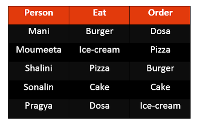 given by Pragya. Mani eats the order given by Shalini. Moumeeta doesn’t eat