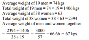 - Average weight of 19 men is 74 kgs, and the average weight of 38 women is 63 kgs. What is the average weight (rounded off to the nearest integer) of all the men and the women together ? (SBI Clerk 2012)