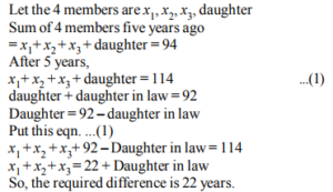 - The sum of the ages of 4 members of a family 5 years ago was 94 years. Today, when the daughter has been married off and replaced by a daughter-in-law, the sum of their ages is 92. Assuming that there has been no other change in the family structure and all the people are alive, what is the difference in the age of the daughter and the daughter-in law ? (IBPS PO/MT 2012)