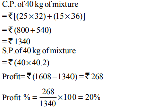 - Manish brought 25 kg of rice at Rs. 32 per kg and 15 kg of rice at Rs. 36 per kg. what profit did he get when he mixed the two varieties together and sold it at Rs. 40.20 per kg? (IBPS SO 2013)