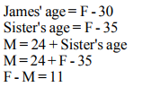 - James' father was 30 years old when he was born. His mother's age was 24 when his sister who is 5 years younger to him, was born. What is the difference between the age of James' father and mother? (IBPS PO Pre 2016)