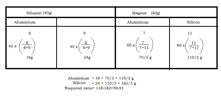 4. Silumin and Magnox are the two alloys which were made by mixing Aluminium and Silicon in the ratio 6:9 and 7:11 respectively. If 40g silumin and 60 g alloy magnox are melted and mixed to form another alloy named Nambe, then what is the ratio of aluminium and silicon in Nambe?