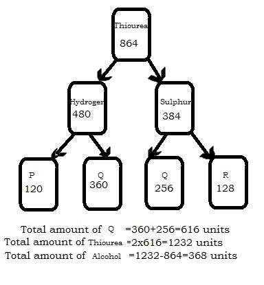 10. Thiourea is a chemical produced by mixing Hydrogen and Sulphur in the ratio of 5: 4. Hydrogen is prepared by mixing two micro elements , P and Q, in the ratio of 1: 3. Sulphur is prepared by mixing two micro elements, Q and R, in the ratio of 2: 1. The final required industrial product is prepared by mixing 864 units of Thiourea with alcohol. If the concentration of the raw material P in the final mixture is 50%, how much alcohol had been added to Thiourea ?