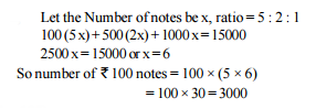 of Rs. 15000 in the form of Rs. 100, Rs. 500 and Rs. 1000 notes. If the ratio