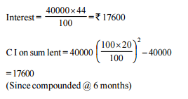 at 44% p.a. simple interest. He lends it to B at 40% p.a. compound interest, compounded