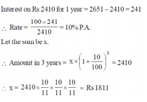 interest amounts to Rs 2410 in 3 years and Rs 2651 in 4 years. Find the sum.