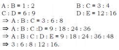 B : C = 3 : 4, C : D = 6 : 9 and D : E = 12 : 16, then A : B : C : D : E is