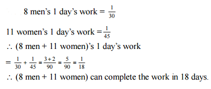 3. 8 men can complete a piece of work in 30 days and 11 women can complete the same piece of work in 45 days. If 8 men and 11 women work together, in how many days will the work be completed?